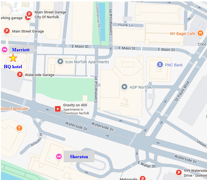 The map below shows the Norfolk Waterside Marriott (yellow star) and Sheraton Norfolk Waterside, with the Main Street, Waterside Street and 999 Waterside Drive Garages labeled.